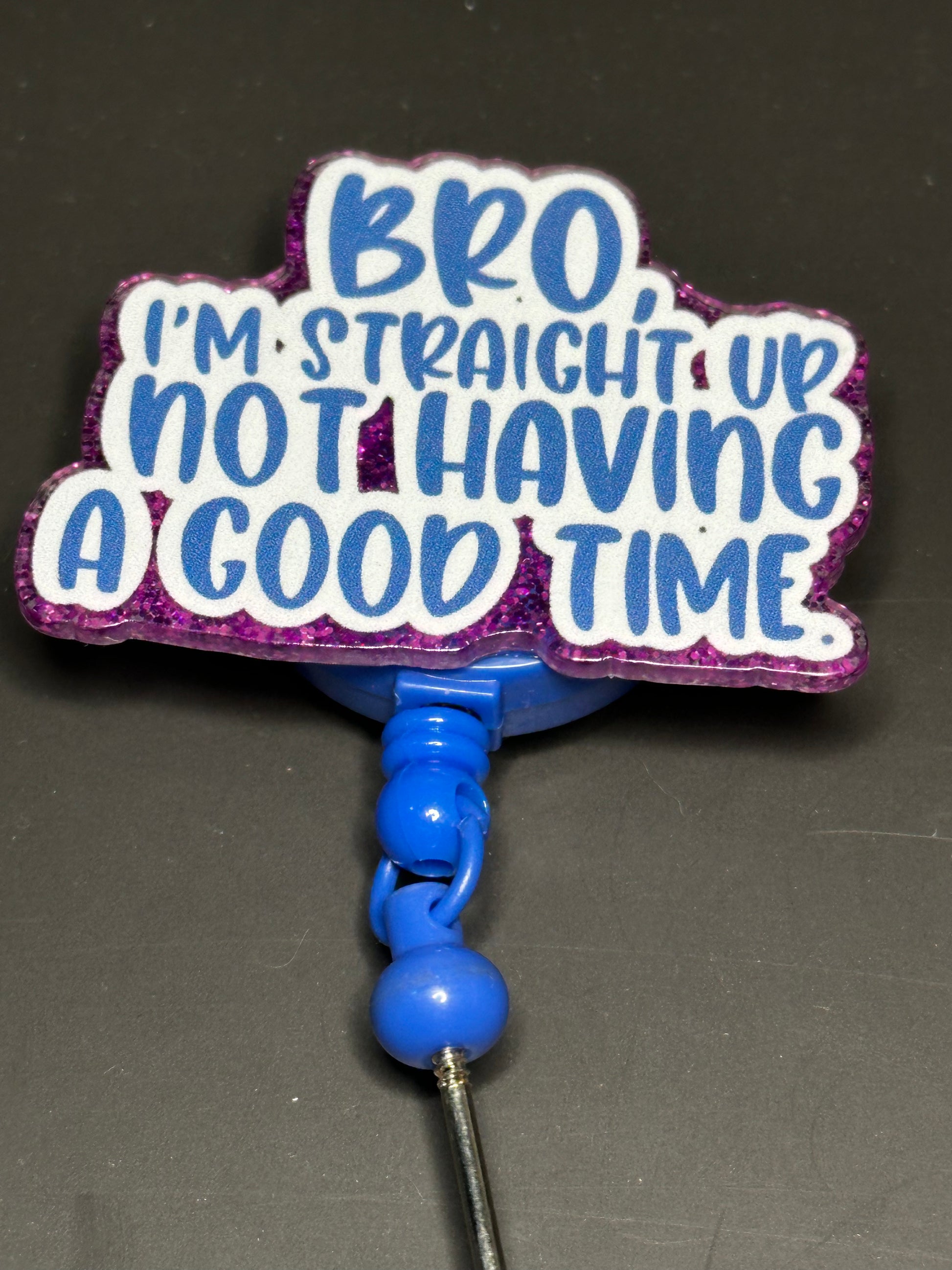 Streamline your daily work routine with the Bro badge reel. The customizable blue reel provides a professional touch, while the pink glitter "Bro, I'm straight up not having a good time" script adds a touch of humor. Easily access your badge with the secure and stylish bro badge reel topper.